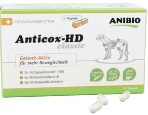Wir geben unseren Welpen ab der 12. Lebenswoche täglich 1 Kapsel Anticox Classic über einen Zeitraum von 6–8 Wochen. Diese Unterstützung erfolgt gezielt während der Wachstumsphase, um die Entwicklung der Gelenke optimal zu fördern.